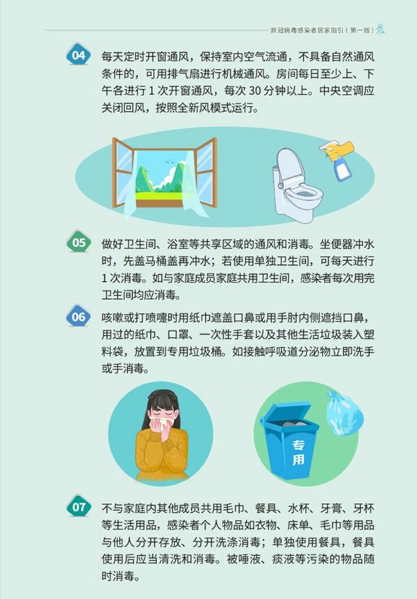 感染者居家治疗期间,应注意做好相应的防护措施,以降低居家传播病毒的风险。比如,在条件允许的情况下,尽可能在家庭相对独立的房间居住,使用单独卫生间。家庭应当配备体温计(感染者专用)、纸巾、口罩、一次性手套、消毒剂等个人防护用品及消毒产品、带盖的垃圾桶。其他详情如图,大家可参考。