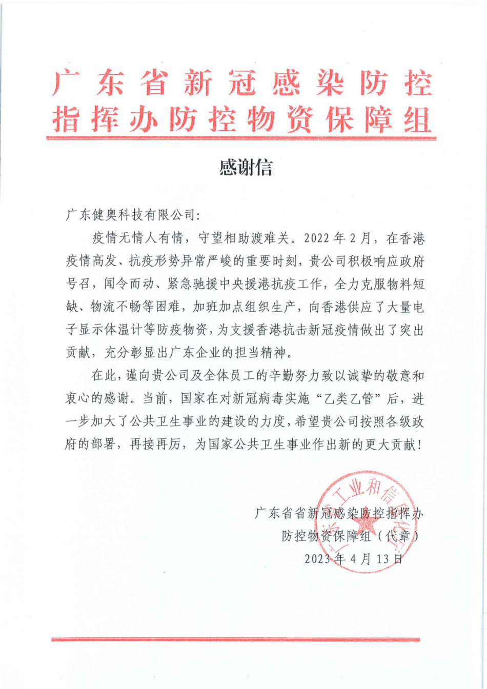 “疫情无情人有情,守望相助渡难关。2022年2月,在香港疫情高发、抗疫形势异常严峻的重要时刻,贵公司积极响应政府号召,闻令而动、紧急驰援中央援港抗疫工作,全力克服物料短缺、物流不畅等困难,加班加点组织生产,向香港供应了大量电子显示体温计等防疫物资,为支援香港抗击新冠疫情做出了突出贡献,充分彰显出广东企业的担当精神。”